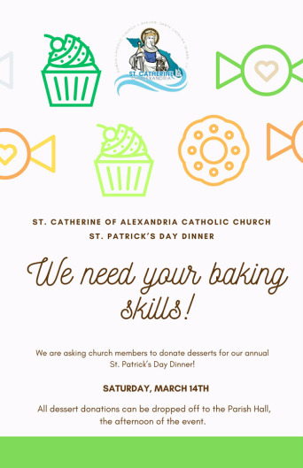 Baked goods needed for the St. Patty's Day dinner! Please consider baking up some scrumptious goodies to support our event. Desserts can be left at the Parish Hall anytime before 5pm on Saturday, March 14.