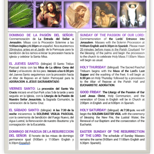 > When available, feel free to pick up a copy of our Parish bulletin. During most weekend Masses, we have an usher who may offer you one. Some weekends, we do not prepare a bulletin if there are no pertinent announcements in order to save paper.
