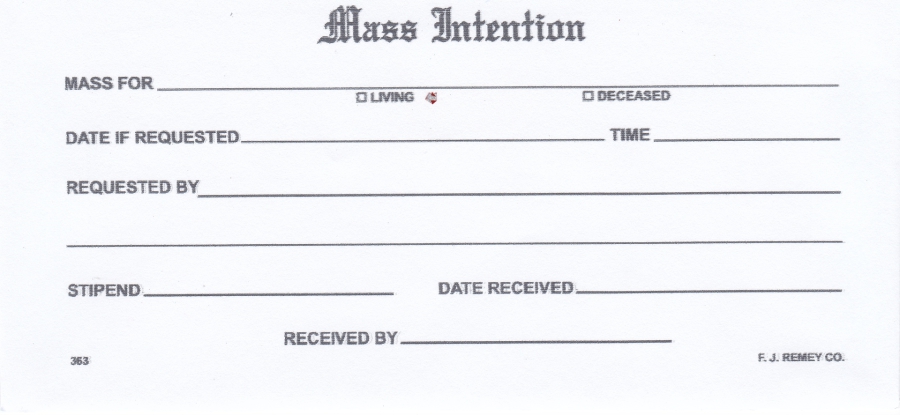 Mass intention envelopes are available at the sacristy. Simply ask a volunteer or the presiding priest (after Mass) and they can direct you to the sacristy, where you can pick up and fill-out an intention card. You may also print and utilize the scanned images below: